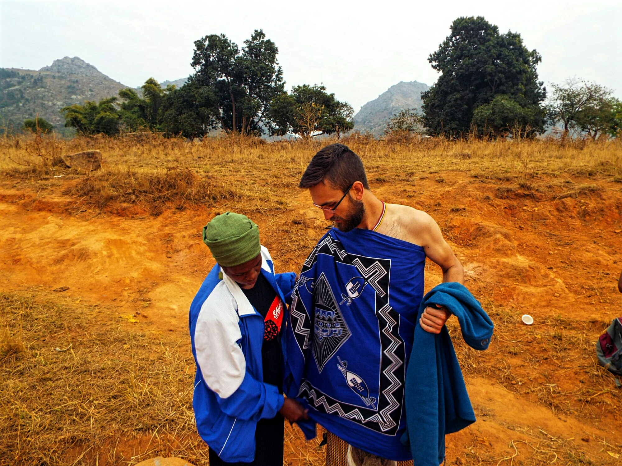 Before the host family appreciation day festivities, Nate gets his lihiya (traditional Swazi top dress) on properly with the assistance of a host make.