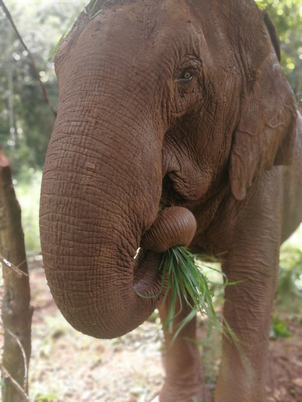 The second day was all about the elephants in the sanctuary. We went down to the sanctuary with many bananas. We were able to feed the elephants in the jungle sanctuary. Once the elephants saw that we had the bananas, the gentle giants approached and took the fruit from our respective hands. Some elephants allowed us to remain close while others walked away to munch on some young bamboo. In the afternoon, we were able to swim with and bathe the elephants in the river. After a full two days of activity, I was tired and sore. I’m super thankful for the hot shower and delicious food I had back in town. The above picture is of me admiring the view at the beginning of the trek, when I was still dirt-free.
